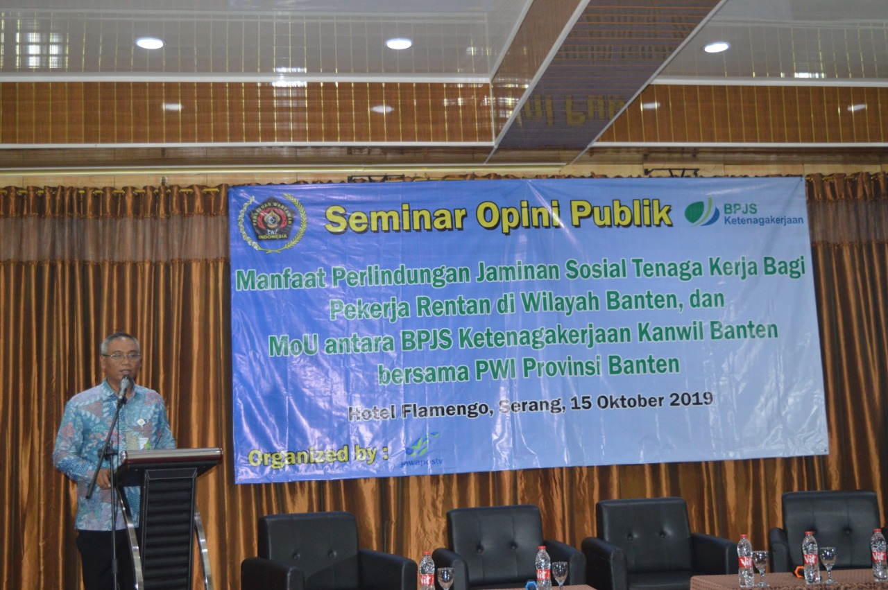 manfaat perlindungan jaminan sosial tenaga kerja bagi pekerja rentan di Wilayah Banten, yang juga sekaligus melakukan MoU antara BPJS ketenagakerjaan Kanwil Banten bersama PWI Provinsi Banten, di salah satu Hotel yang ada di Kota Serang, Selasa, (15/10/2019).