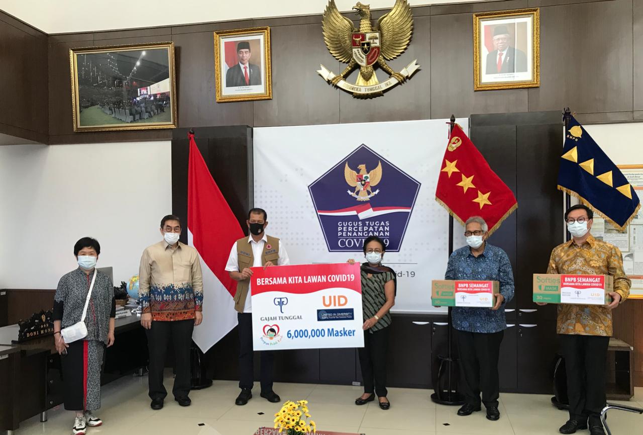 kami serahkan 2 juta masker medis. Adapun sisanya sebanyak 4 juta masker medis akan kami susulkan selanjutnya”, kata Ketua Yayasan UID Tuti Hadiputranto saat penyerahan bantuan tersebut di kantor pusat Badan Nasional Penanggulangan Bencana (BNPB) di Jakarta.