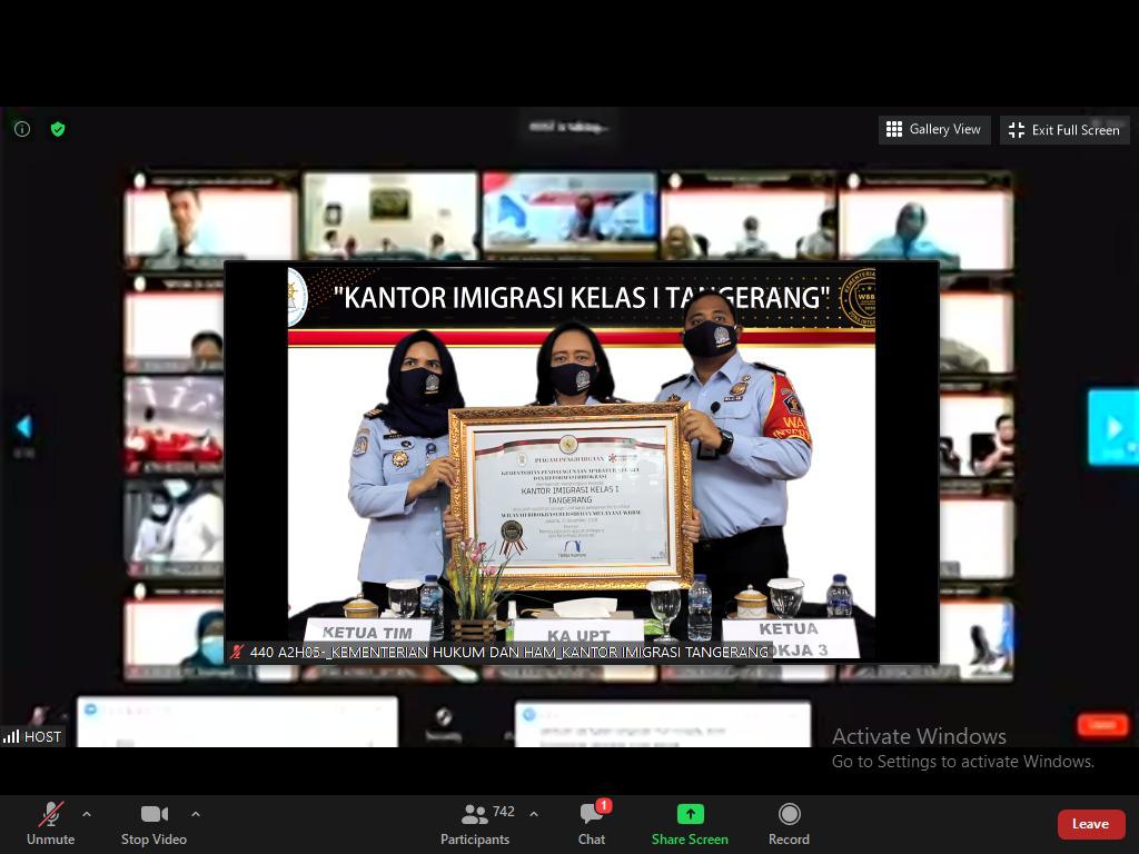Kepala Kantor Imigrasi Tangerang, Felucia Sengky Ratna, didamping ketua ZI dan ketua Tim Pokja III, mengahdiri acara Apresiasi dan Penganugerahan ZI secara virtual. Acara yang diselenggarakan oleh Kementerian PAN dan RB berlangsung dari pukul 08.30 WIB. Terdapat 83 unit kerja Kementerian Hukum dan HAM yang berhasil meraih predikat WBK/WBBM. Dengan rincian satuan kerja Imigrasi yang meraih WBK sebanyak 27 dan WBBM sebanyak 8 satuan kerja.