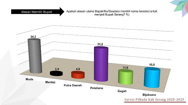 Surya mengungkapkan, ada beberapa alasan memilih yang dikemukakan responden. Diantaranya karena calon Bupati masih muda dengan persentase 34,2%, kedua karena petahana sekitar 31,2%, bijakana 15,8%, gagah 11,6%, putra daerah 4,8%, dan terahir karena sudah mantap sekitar 2,4%.