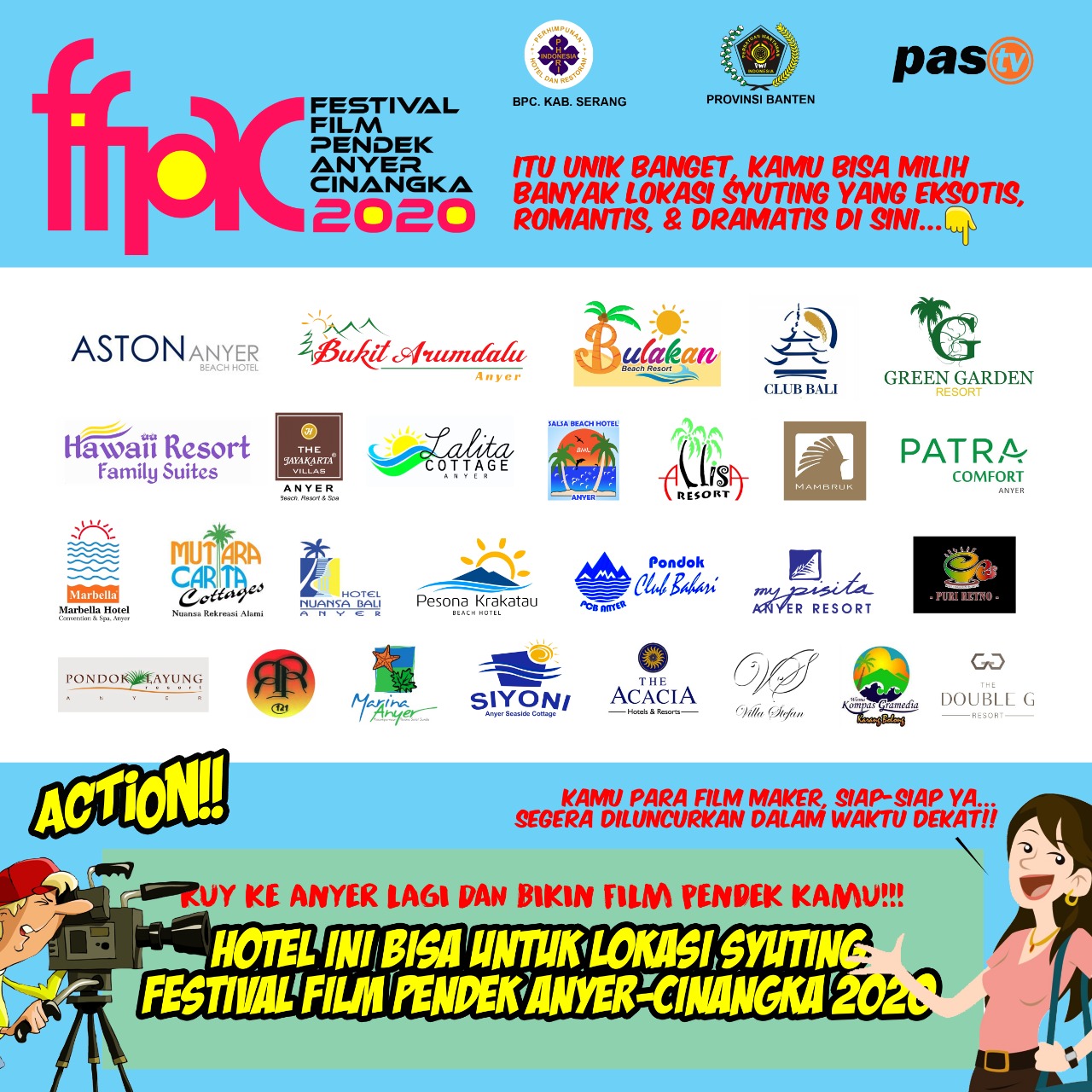 PUSARAN.CO – Puluhan hotel dan destinasi wisata yang tersebar di sepanjang Anyer-Cinangka, Kabupaten Serang, siap membuka akses untuk menjadi lokasi pengambilan gambar bagi para peserta Festival Film Pendek Anyer-Cinangka (FFPAC) 2020. Langkah yang diambil panitia dari PHRI Kabupaten Serang ini menjadi fenomena tersendiri karena baru kali perdana terselenggara.