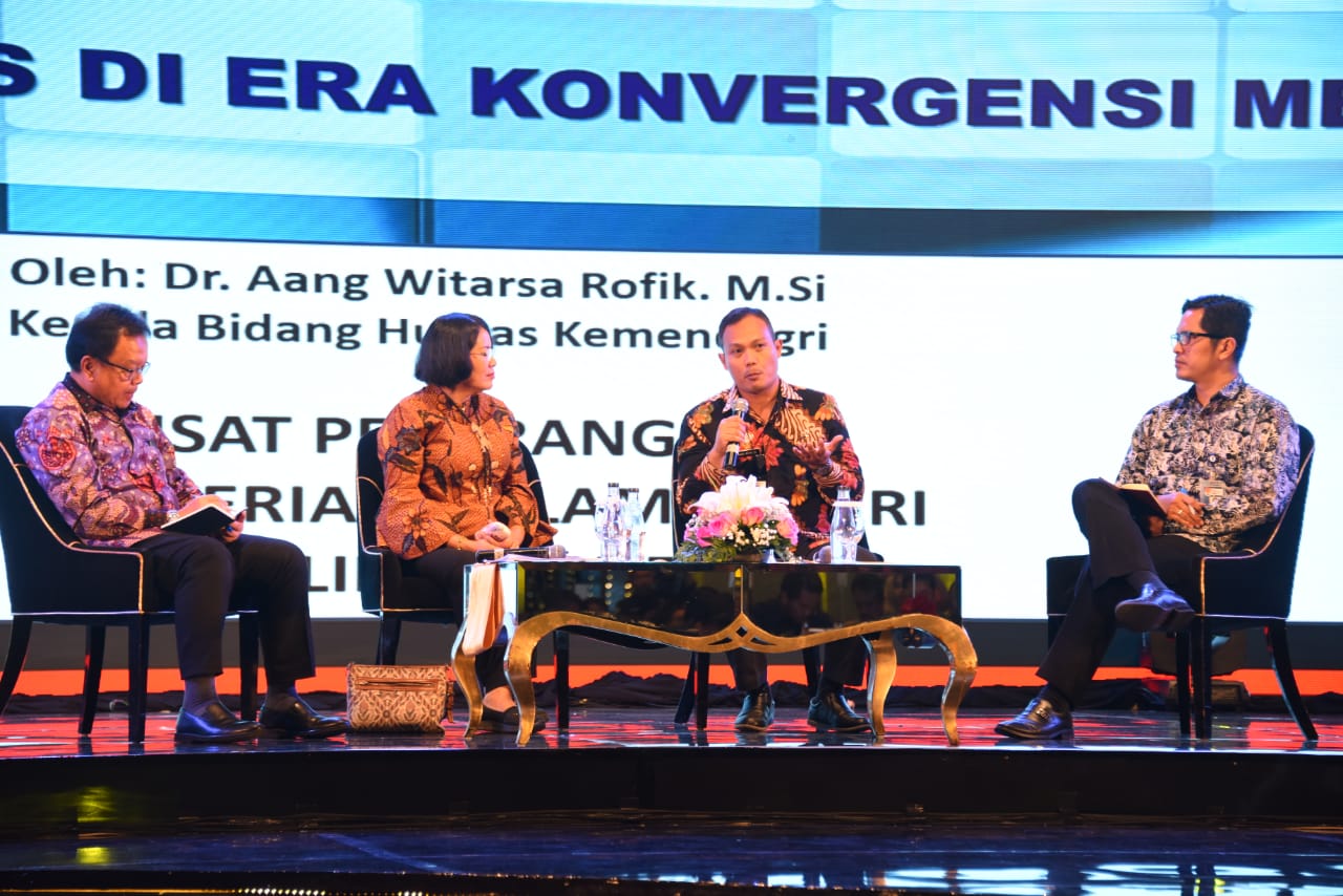 PUSARAN.CO– Kepala Bidang Hubungan Masyarakat Pusat Penerangan Kementerian Dalam Negeri, Aang Witarsa Rofik memaparkan Peran Humas di Era Konvergensi Media dalam acara Piala Humas Jabar-Refleksi 1 Tahun Jabar Juara di The Trans Luxury Hotel, Jumat (09/08/2019).