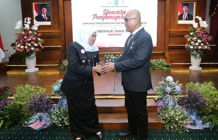 Surabaya – Ketua Umum Persatuan Wartawan Indonesia (PWI) Pusat, Akhmad Munir, menerima Lencana Kehormatan Provinsi Jawa Timur “Jer Basuki Mawa Beya” dari Gubernur Jawa Timur, Khofifah Indar Parawansa pada puncak peringatan Hari Jadi ke-80 Provinsi Jawa Timur, yang digelar di Gedung Negara Grahadi, Surabaya, Minggu (12/10/2025).