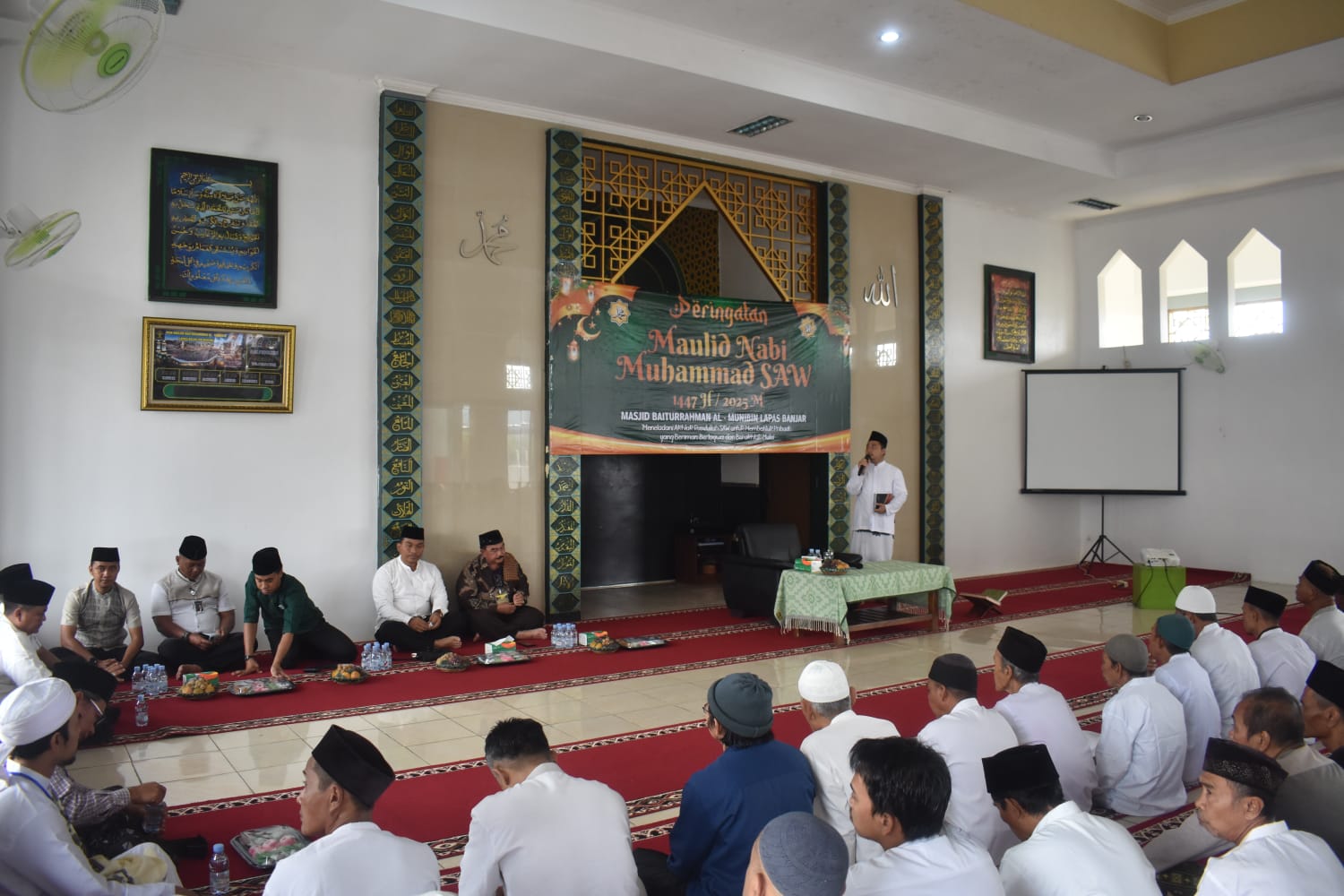 PUSARAN.CO-Lapas Banjar melaksanakan kegiatan Peringatan Maulid Nabi Muhammad SAW 1447 H/ 2025 M dengan Tema ‘Meneladani Akhlak Rasulullah SAW untuk membentuk pribadi yang Beriman, Bertaqwa dan Berakhlak Mulia’, Masjid Baiturrahman Al-Munibin Lapas Banjar, Kamis, 11 September 2025.