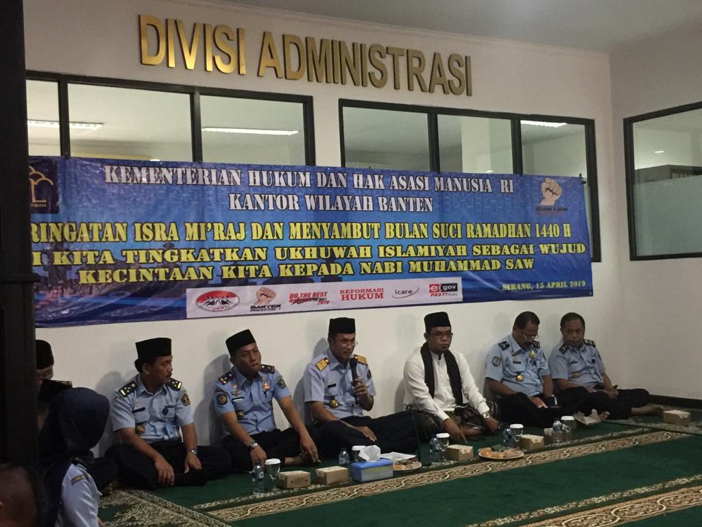 Kepala Kantor Wilayah Kementerian Hukum dan HAM Banten, Imam Suyudi dalam sambutannya menyampaikan bahwa, peringatan Isra Mi’raj selain dalam rangka meningkatkan keimanan dan ketaqwaan, peristiwa isra mi’raj mengingatkan agar senantiasa umat islam melaksanakan sholat, mentaati semua perintah Allah SWT sesuai dengan tuntunannya.