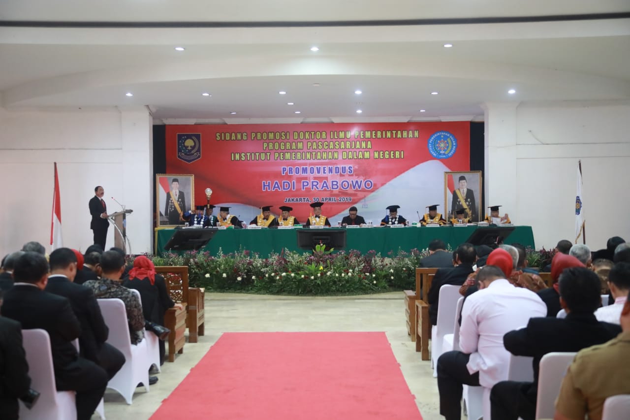 PUSARAN.CO – Tonggak Sejarah Ilmu pengetahuan kembali ditorehkan di Institut Pemerintahan Dalam Negeri (IPDN). Pasalnya Program Pascasarjana IPDN hari ini, Selasa (30/04/2019) melahirkan 1(satu) Doktor di bidang lmu Pemerintahan. Sumbangsih ilmu pengetahuan itu diukir Sekretaris Jenderal Kementerian Dalam Negeri, Hadi Prabowo yang melaksanakan promosi Doktor Ilmu Pemerintahan pada Program Pascasarjana Institut Pemerintahan Dalam Negeri (IPDN) di Gedung Aula Zamhir Islami, Kampus IPDN Jl. Ampera Raya , Cilandak Timur, Jakarta Selatan dengan disertasi berjudul “Pengaruh Inplementasi Kebijaksanaan Pembinaan dan Pengawasan Terhadap Efektifitas Pelaksanaan Otonomi Daerah di Indonesia.”