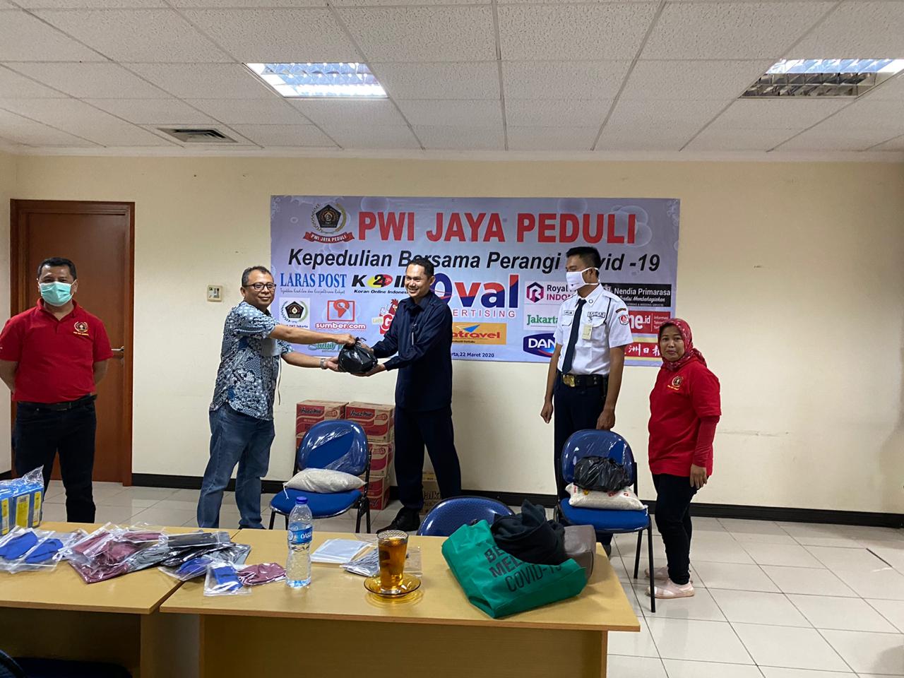 Bertempat di markas PWI Jaya, Jalan Suryapranoto nomor 8, Jakpus, Senin (30/3/2020), sebanyak 30 paket bantuan yang diperoleh PWI Jaya Peduli dari hasil donasi itu diserahkan secara simbolis kepada perwakilan RT setempat.