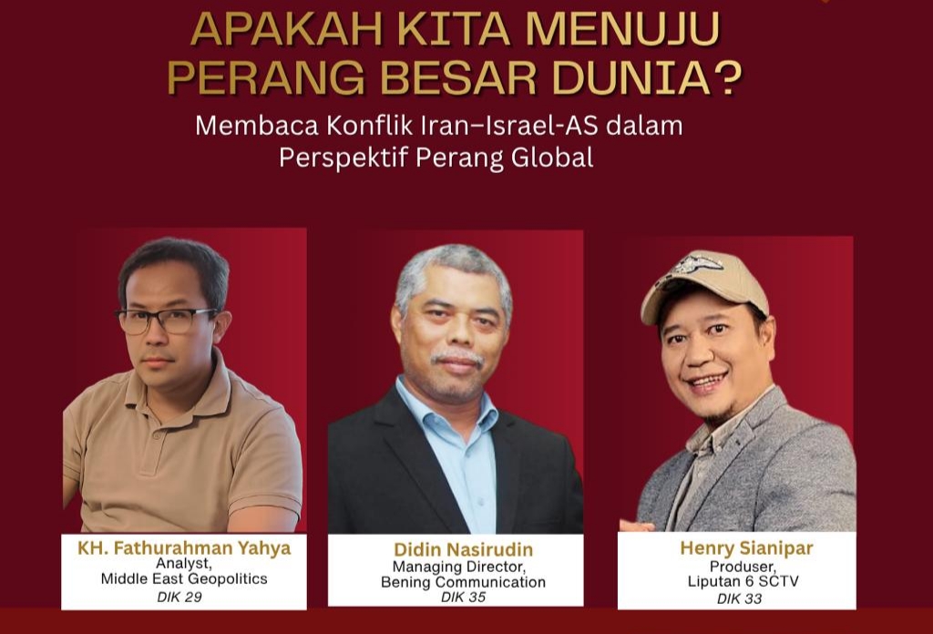 Seminar yang berlangsung di Kediaman Sahid Sudirman, Jakarta Pusat, menghadirkan tiga narasumber lintas bidang, yakni Fathurahman Yahya, sebagai analis geopolitik Timur Tengah/DIK-29, Didin Nasirudin, (praktisi komunikasi strategis/DIK 35), dan Henry Sianipar, (DIK 33) sebagai produser media nasional. Serta iskusi dipandu Mochammad Husni (DIK 31), Vice President Corporate Communication PT Astra Agro Lestari Tbk.