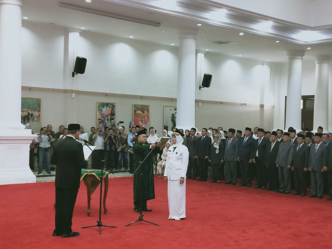 PUSARAN.CO– Gubernur Banten Wahidin Halim secara resmi melantik Wakil Walikota Cilegon sisa Masa Jabatan 2016-2021 Dra. Rt. Ati Marliati, MM di Pendopo Gubernur, KP3B, Curug, Kota Serang pada Rabu (31/7/2019). Dalam sambutannya, Gubernur berpesan agar Wakil Walikota mampu menjalankan tugas pokok dan fungsi khususnya dalam pembenahan perbatasan dan pintu masuk tol serta keindahan dan kebersihan kota.